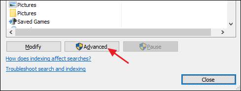 प्रारंभ और "अनुक्रमण विकल्प" टाइप करके "अनुक्रमण विकल्प" विंडो खोलें और फिर "उन्नत" बटन पर क्लिक करें।
