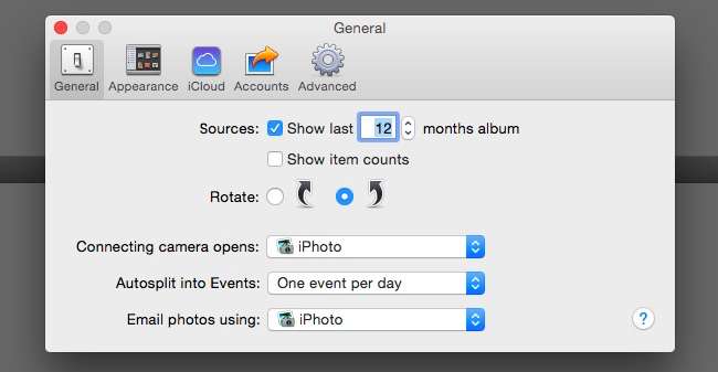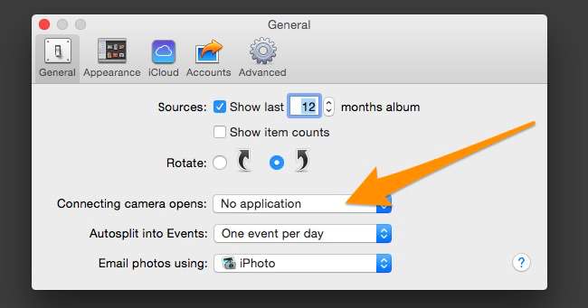 बस iPhoto खोलें और मेनू बार से प्राथमिकताएं पर जाएं, और "कनेक्टिंग कैमरा खुलता है" ड्रॉप-डाउन पर एक नज़र डालें।