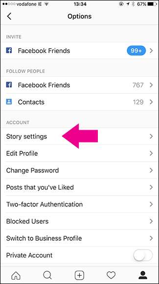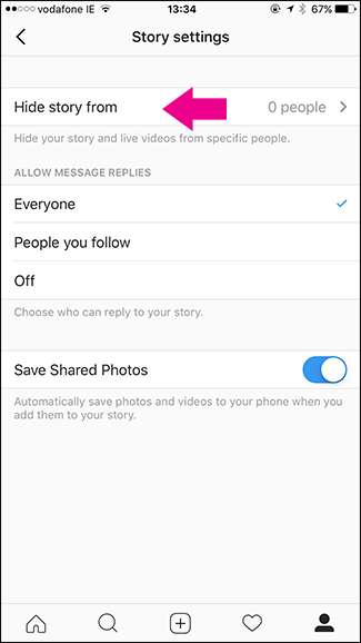 अगला, "स्टोरी सेटिंग्स" पर टैप करें और फिर "से स्टोरी छुपाएं"।