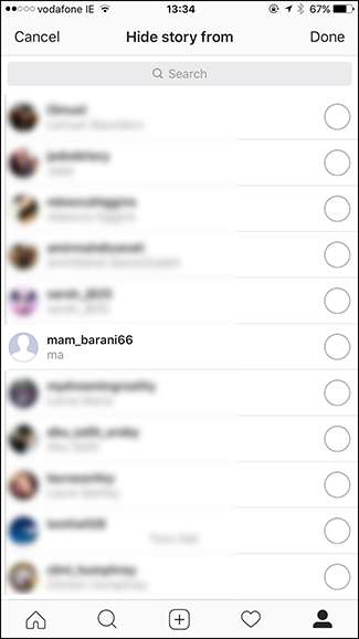 आपको अपने सभी वर्तमान अनुयायियों की एक सूची दिखाई देगी। आप जिस अनुयायी से अपनी स्टोरी छुपाना चाहते हैं, उसके नाम के आगे चेक बॉक्स को टैप करें। पूरा किया, और वे अब आपकी कहानी देखने में सक्षम नहीं होंगे।