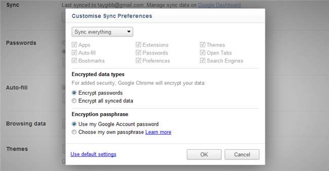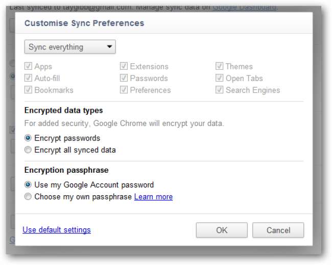 अब क्रोम को बंद करें और इसे फिर से लॉन्च करें। यदि आप रिंच मेनू पर क्लिक करते हैं और विकल्प चुनते हैं, तो व्यक्तिगत विकल्प पर स्विच करना और सिंक सेटिंग्स के तहत कस्टमाइज़ करना आपको दिखाई देगा कि ओपन टैब अब दिखाई देते हैं और वास्तव में सिंक किए जा रहे हैं।