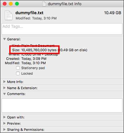 अपनी डमी फ़ाइल के आकार की जांच करने के लिए, इसे राइट-क्लिक करें और "जानकारी प्राप्त करें" चुनें।