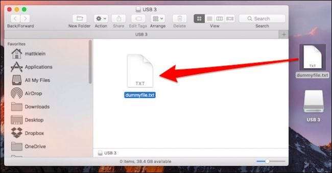 डेस्कटॉप पर आपकी डमी फ़ाइल के साथ, इसे क्लिक करें और इसे नई ड्राइव (हमारे मामले में, हमारी फ्लैश ड्राइव) पर खींचें और माउस बटन को छोड़ने पर स्टॉपवॉच शुरू करें।