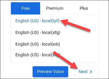 सबसे पहले, स्थापित करें [6 9] प्राकृतिक रीडर अपने आईफोन, आईपैड, या एंड्रॉइड डिवाइस पर ऐप। पहली बात यह है कि हम एक आवाज का चयन करें। चुनने के लिए नि: शुल्क और भुगतान आवाज़ें हैं, एक चुनें और "अगला" टैप करें।