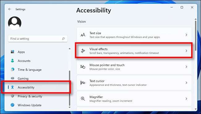 जब सेटिंग्स खुलती हैं, तो साइडबार में "पहुंच" का चयन करें, और उसके बाद सेटिंग्स विंडो के दाईं ओर "दृश्य प्रभाव" पर क्लिक करें।