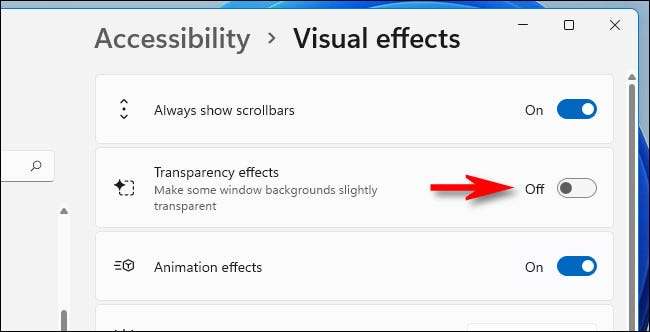 दृश्य प्रभाव सेटिंग्स में, "पारदर्शिता प्रभाव" के बगल में स्विच को "बंद" पर सेट करें।