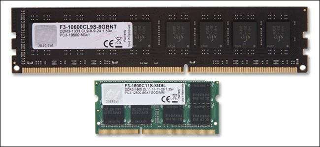 सबसे पहले, डेस्कटॉप के लिए रैम आमतौर पर डीआईएमएम मॉड्यूल (नीचे की छवि में शीर्ष पर चित्रित लंबी छड़ी) में आती है। लैपटॉप के लिए RAM- और कुछ अल्ट्रा कॉम्पैक्ट डेस्कटॉप- छोटे SODIMM मॉड्यूल (नीचे की छवि में नीचे की तरफ छोटा) में आता है।