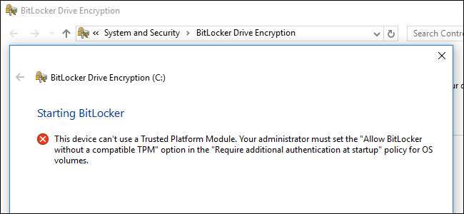 BitLocker के फुल-डिस्क एन्क्रिप्शन सामान्य रूप से एक विश्वसनीय प्लेटफ़ॉर्म मॉड्यूल (TPM) के साथ एक कंप्यूटर की आवश्यकता होती है। टीपीएम के बिना पीसी पर BitLocker को सक्षम करने का प्रयास करें, और आपको बताया जाएगा कि आपके व्यवस्थापक को एक सिस्टम नीति विकल्प सेट करना होगा।