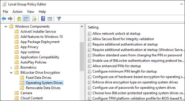 स्थानीय कंप्यूटर नीति> कंप्यूटर कॉन्फ़िगरेशन> व्यवस्थापकीय टेम्पलेट> Windows घटक> BitLocker Drive एन्क्रिप्शन> ऑपरेटिंग सिस्टम ड्राइव को बाएँ फलक में नेविगेट करें।