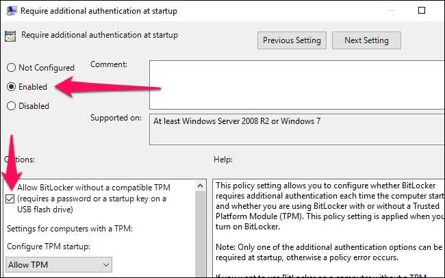 विंडो के शीर्ष पर "सक्षम" का चयन करें, और एक संगत TPM के बिना "BitLocker को अनुमति दें (USB फ्लैश ड्राइव पर पासवर्ड या स्टार्टअप कुंजी की आवश्यकता है) सुनिश्चित करें" चेकबॉक्स यहां सक्षम है।
