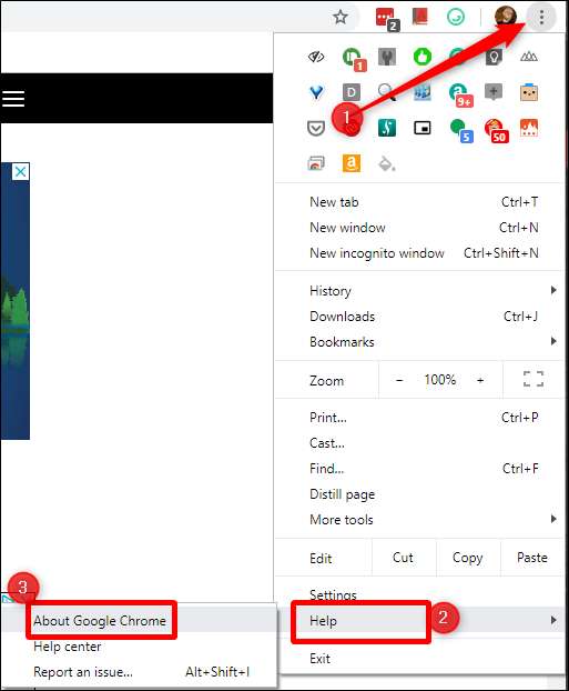 पहले चीजें - आपको यह सुनिश्चित करने की आवश्यकता होगी कि आपका Chrome इंस्टॉलेशन 75 संस्करण पर है। ऊपरी दाईं ओर स्थित तीन-डॉट मेनू बटन पर क्लिक करें, "हेल्प" मेनू पर जाएँ, और फिर "लगभग चोम" पर क्लिक करें।