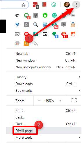 क्रोम में रीडर मोड का उपयोग करना आसान है। जब आप किसी ऐसे पृष्ठ पर हों, जिसे आप पाठक के दृष्टिकोण में धकेलना चाहते हैं, तो ऊपरी दाएँ भाग में तीन-डॉट मेनू बटन पर क्लिक करें और फिर "डिस्टिल पृष्ठ" चुनें। यह ध्यान देने योग्य है कि यह क्रिया संभवतः बदल जाएगी क्योंकि यह सुविधा ध्वज स्थिति से बाहर निकल जाती है और स्थिर हो जाती है। लेकिन अभी के लिए, आप जो ढूंढ रहे हैं। साथ ही, उम्मीद है कि, कीबोर्ड शॉर्टकट कुछ बिंदु पर उपलब्ध होगा।