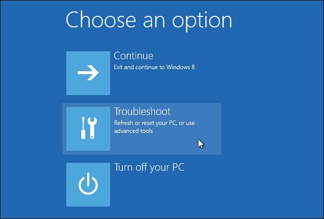 एक बार जब आप उन्नत स्टार्टअप विकल्पों तक पहुँचा , आपको समस्या निवारण और मरम्मत विकल्पों तक पहुँचने के लिए समस्या निवारण विकल्प पर क्लिक (या टैप) करने की आवश्यकता होगी। अपने पीसी विकल्पों को जारी रखें और बंद करें विंडोज को बूट करना जारी रहेगा (यह मानते हुए कि कोई समस्या नहीं है) या आपके कंप्यूटर को बंद कर देगा।