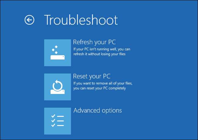समस्या निवारण स्क्रीन के लिए आसान पहुँच प्रदान करता है ताज़ा करें और अपने पीसी विकल्पों को रीसेट करें । यह विशेष रूप से उपयोगी है यदि आप अपने पीसी को रिफ्रेश या रिसेट करना चाहते हैं, लेकिन विंडोज में नहीं कर सकते।