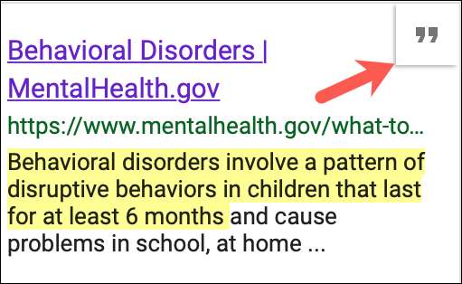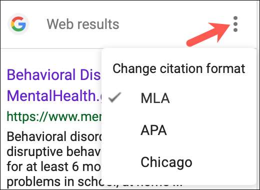 उद्धरण प्रारूप बदलने के लिए, वेब परिणामों के शीर्ष पर "उद्धरण प्रारूप का चयन करें" आइकन (तीन डॉट्स) पर क्लिक करें। फिर, विधायक, एपीए, या शिकागो चुनें।