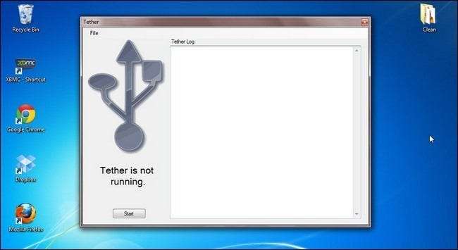 जब आप इसे पहली बार चलाते हैं तो यह बहुत अधिक नहीं होता है, यह केवल प्रक्रिया शुरू करने के लिए आपके इंतजार में बेकार बैठता है। अब आपके एंड्रॉइड फोन के सिंक केबल में प्लग करने और आपके कंप्यूटर पर फोन को टिक करने का समय है। आपको डिबग मोड सक्षम होना चाहिए। अपने Android फ़ोन पर, नेविगेट करने के लिए कुछ समय निकालें सेटिंग्स> अनुप्रयोग> विकास और जाँच करें यूएसबी डिबगिंग । जब आप पुष्टि कर लें कि आपका डीबगिंग चालू है और आपका फ़ोन कनेक्ट है, तो क्लिक करें शुरू अपने कंप्यूटर पर Tether इंटरफ़ेस में।
