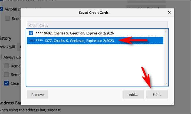 पॉप अप करने वाली खिड़की में, फ़ायरफ़ॉक्स उन सभी क्रेडिट कार्ड की एक सूची दिखाएगा जो इसे बचाए गए हैं। उस कार्ड का चयन करें जिसे आप नंबर देखना चाहते हैं और "संपादित करें" पर क्लिक करें।