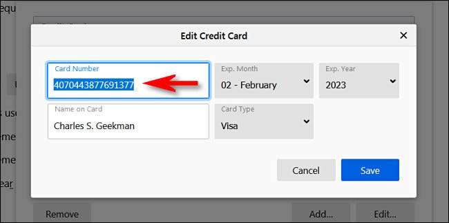 यदि आपको अपने क्रेडिट कार्ड नंबर की आवश्यकता है, लेकिन आपके पास अपना कार्ड नज़दीक नहीं है, तो इसे मोज़िला फ़ायरफ़ॉक्स से पुनर्प्राप्त करना संभव है यदि ब्राउज़र ने इसे आपके लिए संग्रहीत किया है स्वत: भरण भूतकाल में। ऐसे।