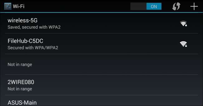 एक बार नीली संकेतक प्रकाश चालू और ठोस होने पर, वाई-फाई सक्षम डिवाइस को पकड़ो और नाम के साथ वाई-फाई एक्सेस प्वाइंट की तलाश करें FileHub-XXXX जिसमें XXXX आपकी फ़ाइलहब इकाई को निर्दिष्ट एक विशिष्ट पहचानकर्ता है।