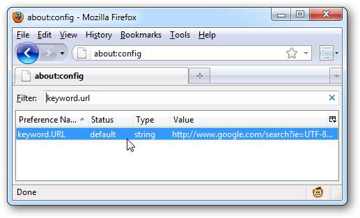 लेकिन अगर आप इसके बजाय खोज परिणाम पृष्ठ पर जाएं तो क्या होगा? सौभाग्य से, आपको बस इतना करना है कि फ़ायरफ़ॉक्स में एक के बारे में: config पैरामीटर। बस के बारे में सिर: पता पट्टी में कॉन्फ़िगर करें, और फिर के लिए फ़िल्टर करें keyword.url इस तरह: