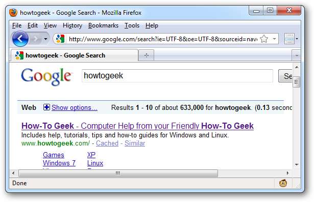 पर कैसे? बहुत आसान! यदि आपने Google में "howtogeek" टाइप किया है, और फिर "I’m Feeling Lucky" बटन पर क्लिक किया है, तो यह वही जगह है जो आपको पहले परिणाम पर ले जाती है। जब आप किसी URL के पते वाले पते में कुछ डालते हैं, तो फ़ायरफ़ॉक्स पर्दे के पीछे ऐसा करता है।