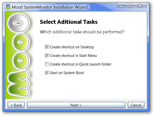 स्थापित करने की प्रक्रिया सीधी और आसान है। इंस्टॉल प्रक्रिया के दौरान रुचि का एक बिंदु यह है कि नीचे दिखाए गए अनुसार Moo0 सिस्टम मॉनिटर आपके कंप्यूटर के साथ हर बार शुरू होने का विकल्प है। डिफ़ॉल्ट हर बार आपके कंप्यूटर के साथ ऐप शुरू होता है, इसलिए यदि आप फुल-टाइम की बजाय डिमांड पर M00 सिस्टम मॉनिटर चलाना पसंद करते हैं, तो "सिस्टम बूट पर शुरू करें" को अचयनित करें।
