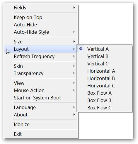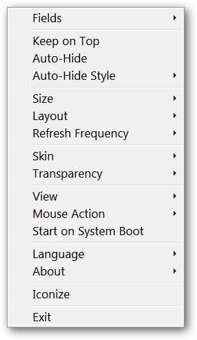 यहाँ है जहाँ Moo0 सिस्टम मॉनिटर वास्तव में चमकता है! विकल्प मेनू का उपयोग करने के लिए Moo0 सिस्टम मॉनिटर विंडो पर राइट क्लिक करें। जैसा कि आप देख सकते हैं, आप फ़ील्ड्स, ऑटो-हाईड स्टाइल, साइज़, लेआउट, रिफ्रेश फ़्रीक्वेंसी, स्किन्स, ट्रांसपेरेंसी, व्यू, माउस एक्शन और लैंग्वेज के लिए सब-मेन्यू एक्सेस कर सकते हैं। आप सचमुच अपने दिल की इच्छा के लिए Moo0 सिस्टम मॉनिटर को अनुकूलित कर सकते हैं!