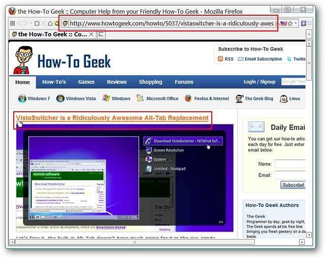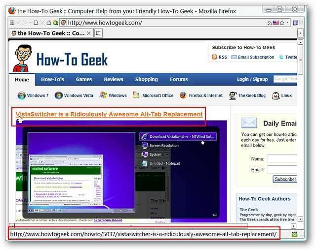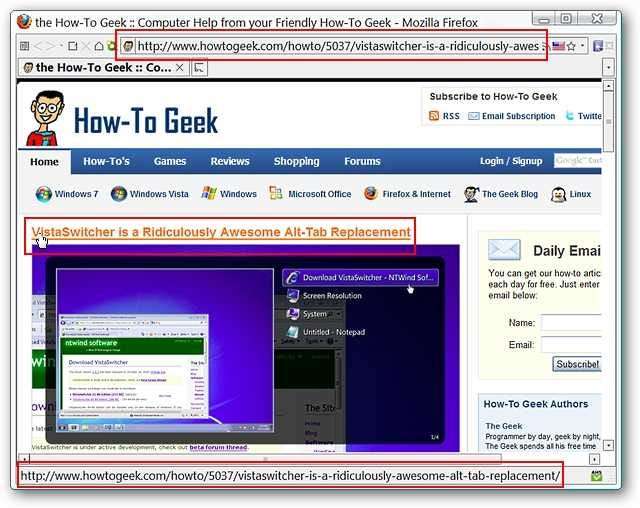 यहाँ वेबलिंक के लिए सामान्य "स्टेटस बार" एड्रेस डिस्प्ले है जिसे हम अपने ब्राउजर में माउस पर मँडरा रहे थे। यह अच्छा है लेकिन अगर आप वास्तव में "स्टेटस बार" को छिपाए रखना चाहते हैं तो आप क्या करते हैं? उस प्रदर्शन को बेहतर (और निश्चित रूप से अधिक सुविधाजनक) स्थान पर ले जाएं।