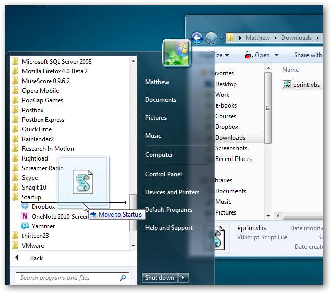 यह प्रिंट कतार फ़ोल्डर आपको ड्रॉपबॉक्स के साथ सिंक किए गए किसी भी कंप्यूटर या मोबाइल डिवाइस पर दिखाई देगा, लेकिन केवल vbs स्क्रिप्ट चलाने वाले कंप्यूटर से प्रिंट होगा। इसलिए, आप चाहते हैं कि यह स्क्रिप्ट हमेशा आपके प्राथमिक कंप्यूटर पर चले। बस खींचें Eprint.Wabs अपने स्टार्टअप फ़ोल्डर में फ़ाइल करें, और फिर जब भी आपका कंप्यूटर चल रहा हो, तब यह आपकी फ़ाइलों को प्रिंट करने के लिए हमेशा तैयार रहेगा।