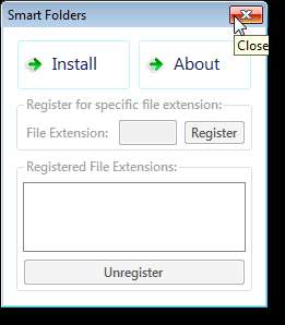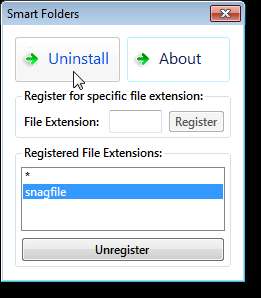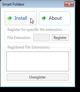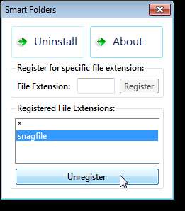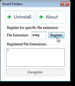जब आप इसे इंस्टॉल करते हैं तो स्मार्ट फोल्डर स्वचालित रूप से डिफ़ॉल्ट रूप से सभी एक्सटेंशनों के लिए पंजीकृत होता है, लेकिन क्योंकि विंडोज और अन्य प्रोग्राम अपने स्वयं के विशिष्ट फ़ाइल एक्सटेंशनों के लिए खुद को पंजीकृत करते हैं, तो आपको मैन्युअल रूप से कुछ एक्सटेंशनों को पंजीकृत करना पड़ सकता है। ऐसा करने के लिए, विस्तार (अवधि के बिना) दर्ज करें और रजिस्टर पर क्लिक करें।