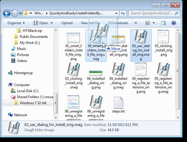 फ़ोल्डर उस फ़ोल्डर के सबफ़ोल्डर के रूप में बनाया जाता है, जिसमें आपके द्वारा खींची और खोई गई फ़ाइलें होती हैं और दो फ़ाइलों को नए फ़ोल्डर में ले जाया जाता है। अब आप अन्य फ़ाइलों को फ़ोल्डर में चुन सकते हैं और खींच सकते हैं।