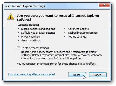 आपको सत्यापित करना होगा कि आप सभी इंटरनेट एक्सप्लोरर सेटिंग्स को रीसेट करना चाहते हैं। यदि आप चुनते हैं, तो आप अपनी सभी व्यक्तिगत सेटिंग्स को भी हटा सकते हैं, लेकिन स्थिरता के मुद्दों को ठीक करने के लिए यह आवश्यक नहीं होना चाहिए।