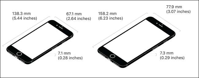 भौतिक आकार दो फोन के बीच सबसे स्पष्ट अंतर है। IPhone 7 2.64 इंच चौड़ा, 5.44 इंच लंबा 0.28 इंच गहरा और 4.87 औंस वजन का है। IPhone 7 Plus 3.07 इंच चौड़ा, 6.23 इंच लंबा 0.29 इंच गहरा और 6.63 औंस पर थोड़ा अधिक वजन का है। न तो वास्तव में एक छोटा फोन है, लेकिन प्लस काफ़ी बड़ा है।