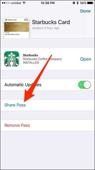 ऐसा करने के लिए, पास को खोलें और स्क्रीन के निचले-दाएं कोने में "i" बटन को टैप करें। वहां से, "शेयर पास" विकल्प पर टैप करें।