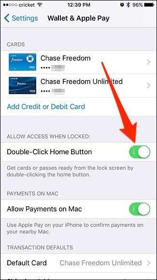 "वॉलेट और ऐप्पल पे" स्क्रीन पर, "डबल-क्लिक होम बटन" विकल्प को सक्षम करें, अगर यह पहले से ही सक्षम नहीं है।