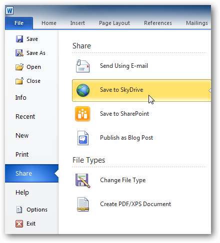 बाईं ओर स्थित शेयर टैब पर क्लिक करें जहां यह आपको स्काईड्राइव, SharePoint पर दस्तावेज़ साझा करने, अपने ब्लॉग को प्रकाशित करने, या ईमेल के रूप में भेजने के लिए विकल्प देता है।