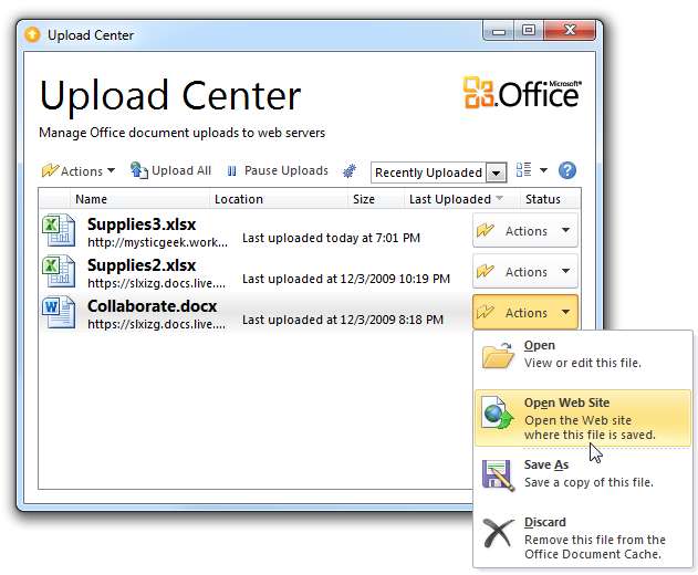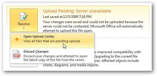 Office 2010 में अपलोड केंद्र नामक एक सुविधा है जो आपको आपके द्वारा अपलोड किए गए दस्तावेज़ों का ट्रैक रखने की अनुमति देता है। यहां से आप सर्वर पर अपलोड किए गए दस्तावेजों को प्रबंधित कर सकते हैं।