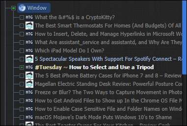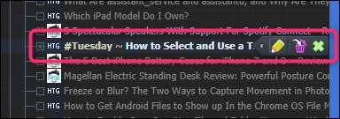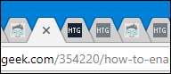 कचरा पूरी तरह से टैब बंद कर देता है, और एक्स आइकन टैब को निलंबित कर देता है। जब आप एक टैब निलंबित करते हैं, तो यह शीर्षक टैब आउटलाइनर विंडो में मंद होता है। नीचे की छवि में, मंद टैब निलंबित हैं, नीले पाठ के साथ टैब खुले हैं, और सफेद पाठ वाला टैब वर्तमान में क्रोम में चयनित टैब है।