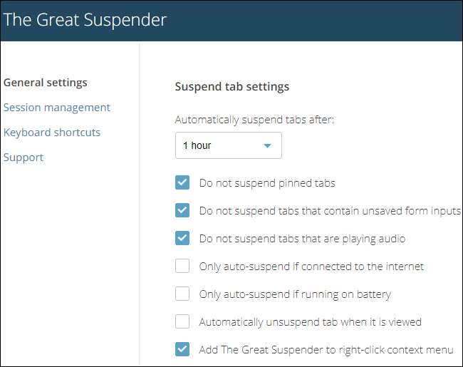 ग्रेट सस्पेंडर आपको उस अंतराल से स्वचालित रूप से निष्क्रिय टैब को निलंबित करके उस दुख से बचाता है। निलंबित टैब ब्राउज़र विंडो में खुले रहते हैं, लेकिन किसी भी संसाधन का उपभोग नहीं करते हैं। टाइटल बार में सस्पेंडेड टैब थोड़े डिम होते हैं।