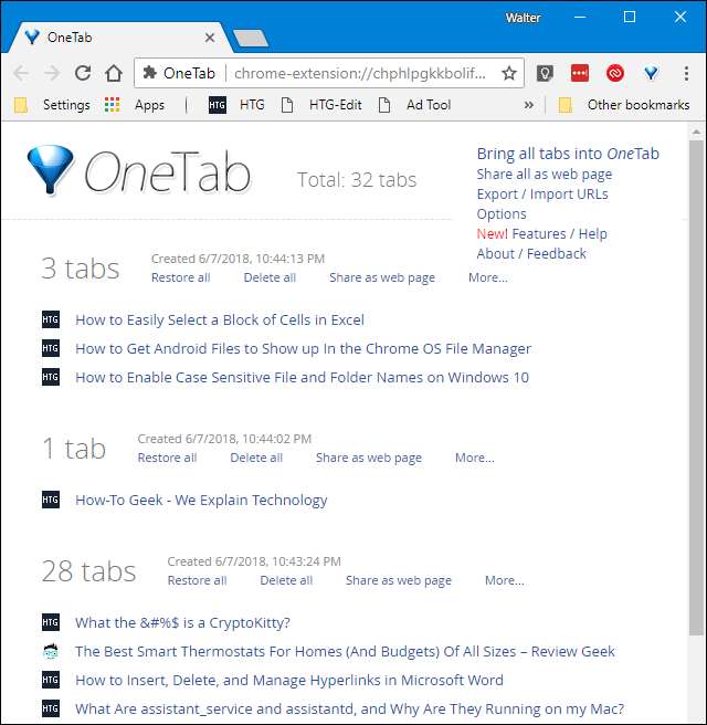 यदि आप उसी विंडो में अधिक टैब खोलते हैं, और फिर OneTab को फिर से सक्रिय करते हैं, तो यह नए टैब को उसी पेज पर अपने समूह में सहेजता है, जब आपने उन्हें सहेजा था।