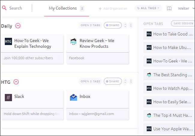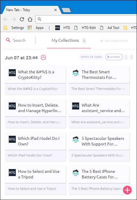टोबी ने अपने नए टैब पृष्ठ को टैब के प्रबंधन के लिए अपने संगठनात्मक पृष्ठ के साथ बदल दिया। टोबी टैब को व्यवस्थित करने के लिए संग्रह का उपयोग करता है, और आप उन्हें पृष्ठ के बाईं ओर देखेंगे। नीचे दी गई छवि में, हमें "दैनिक" और "HTG" नाम के संग्रह मिले हैं, जिनमें पहले से सहेजे गए दो-दो पृष्ठ हैं।