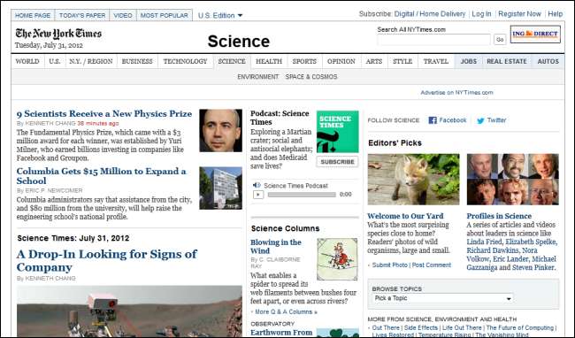 न्यूयॉर्क टाइम्स में एक विशेष है विज्ञान पृष्ठ जो पर्यावरण और अंतरिक्ष और ब्रह्मांड के बारे में वर्तमान वैज्ञानिक घटनाओं को कवर करता है।