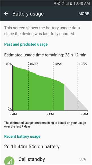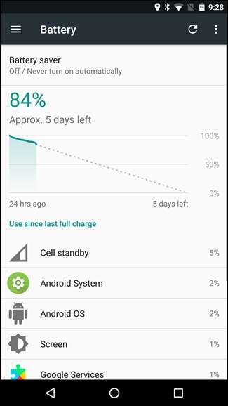 इस स्क्रीन पर, आप देख सकते हैं कि आपकी बैटरी के माध्यम से क्या चबाना है, एक अच्छा ग्राफ और ऐप या सेवा द्वारा टूटने के साथ पूरा हुआ। यदि कोई एप्लिकेशन समस्या पैदा करता है, तो यह वह जगह है जहां आप इसे देखेंगे।