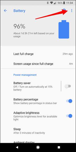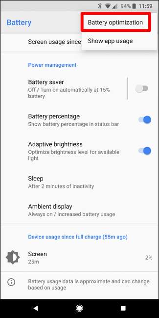 इन सेटिंग्स तक पहुंचने के लिए, बैटरी मेनू (सेटिंग्स> बैटरी) में वापस जाएं, फिर ऊपरी दाएं कोने में तीन-डॉट ओवरफ़्लो मेनू पर टैप करें। वहां से, "बैटरी ऑप्टिमाइज़ेशन" चुनें।