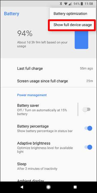 अंत में, ओरेओ में, Google ने "पूर्ण उपकरणों के उपयोग को दिखाने के लिए" विकल्प वापस लाया। इसका मतलब है कि आप देख सकते हैं कि कौन से ऐप बैटरी का उपयोग कर रहे हैं, और बैटरी उपयोग के लिए हार्डवेयर आँकड़े। यह दिखाने के लिए, ऊपरी दाएं कोने में तीन-डॉट ओवरफ़्लो मेनू टैप करें, फिर "पूर्ण डिवाइस उपयोग दिखाएं" चुनें। एप्लिकेशन दृश्य पर वापस जाने के लिए, समान कार्य करें और "एप्लिकेशन उपयोग दिखाएं" चुनें।