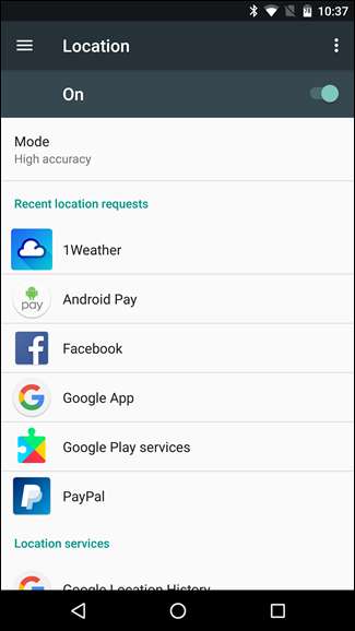 GPS के साथ, चीजें कट और ड्राई और "ऑन" और "ऑफ" नहीं होती हैं। दिन में वापस, यह एक था राक्षसी बैटरी हॉग, इसलिए Google ने इससे पूर्ण निरपेक्षता को अनुकूलित किया- आजकल, इसका उपयोग केवल तब ही किया जाता है, जब इसका पूर्ण रूप से उपयोग किया जाना है, और केवल जब तक इसकी आवश्यकता है। उदाहरण के लिए, जब आप ऐप खोलते हैं तो आपका मौसम ऐप वर्तमान स्थान के बारे में संक्षेप में जांच कर सकता है ताकि यह सबसे सटीक पूर्वानुमान प्रदान कर सके। यदि आप नेविगेशन का उपयोग कर रहे हैं, तो दूसरी ओर, जीपीएस पूरे समय पर रहेगा, क्योंकि, आप जानते हैं ... निर्देश।