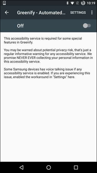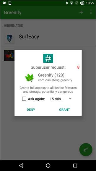 यदि आप गैर-रूट किए गए हैंडसेट पर काम कर रहे हैं, तो आपको ग्रीनरी को अतिरिक्त अनुमति देने की आवश्यकता होगी। एक बार जब आप "ZZZ" बटन पर क्लिक करते हैं, तो नीचे एक पॉपअप दिखाई देगा, जिससे आपको पता चल जाएगा कि आपको एप्लिकेशन एक्सेस सेटिंग सेटिंग देने की आवश्यकता है। सीधे पहुंच मेनू में कूदने के लिए बटन पर क्लिक करें, फिर "ग्रीनाइज़ - स्वचालित हाइबरनेशन" चुनें। इस बारे में स्पष्टीकरण दिया गया है कि इसे यहाँ सक्षम करने की आवश्यकता क्यों है - इस पर पढ़ें, फिर शीर्ष बार में टॉगल पर क्लिक करें। एक चेतावनी पॉप अप करेगी, आगे बढ़ो और पुष्टि करने के लिए "ओके" पर टैप करें। उसके बाद, आप Greenify ऐप पर वापस जा सकते हैं।