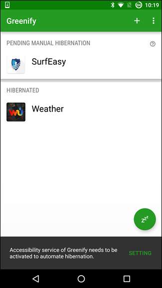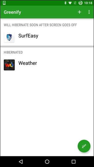 एक बार जब आप उन ऐप्स को चुन लेते हैं, जिन्हें आप सोना चाहते हैं, तो नीचे दाईं ओर स्थित चेक मार्क एक्शन बटन पर टैप करें। यह आपको प्राथमिक Greenify स्क्रीन पर वापस ले जाएगा, जिसमें दिखाया जाएगा कि कौन से ऐप पहले से ही हाइबरनेट हैं और स्क्रीन बंद होने के तुरंत बाद कौन से होंगे। यदि आप ऐप्स को तुरंत हाइबरनेशन में धकेलना चाहते हैं, तो "ZZZ" बटन पर टैप करें।