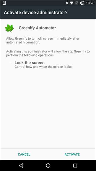 यहां दो विकल्प हैं: "हाइबरनेट + लॉक स्क्रीन", जो आपके ऐप्स को हरा कर देगा और फिर डिस्प्ले बंद कर देगा, या "हाइबरनेट नाउ", जो ऐप्स को हरा देगा और डिस्प्ले को छोड़ देगा। अपना चयन करें - यदि आप "हाइबरनेट + लॉक स्क्रीन" विकल्प का उपयोग करना चाहते हैं, तो आपको ग्रीनिफाई डिवाइस एडमिनिस्ट्रेशन एक्सेस देना होगा। पहली बार जब आप विजेट टैप करते हैं, तो यह आपको बताएगा कि इसे इस विशेषाधिकार की आवश्यकता है - बस "सक्रिय करें" पर टैप करें और आप जाने के लिए अच्छा हैं। अब से, जब आप उस विजेट को टैप करते हैं, तो आपके ऐप्स को हाइबरनेशन में धकेल दिया जाएगा और डिस्प्ले बंद हो जाएगा।