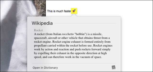 बहुत से लोग macOS के साथ आने वाले डिक्शनरी एप्लिकेशन को नजरअंदाज करते हैं, और यह बहुत बुरा है: यह एक शब्दकोश से एक पूरी बहुत अधिक । शायद मेरी पसंदीदा विशेषता पूरे ऑपरेटिंग सिस्टम के साथ इसका एकीकरण है: किसी भी चीज़ के बारे में हाइलाइट करें और राइट-क्लिक करें, या इसका उपयोग करें थ्री फिंगर टैप जेस्चर , और आप जल्दी से किसी भी शब्द को देख सकते हैं। जैसा कि यह पता चला है, यह इमोजी के लिए भी काम करता है: